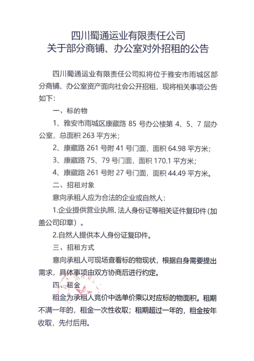 四川蜀通運業(yè)有限責任公司關于部分商鋪、辦公室對外招租的公告