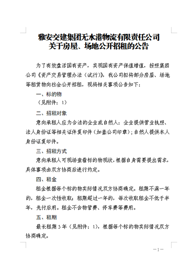 雅安交建集團無水港物流有限責任公關于房屋、場地公開招租的公告