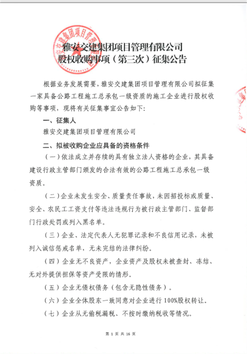 雅安交建集團(tuán)項目管理有限公司股權(quán)收購事項(第三次)征集公告