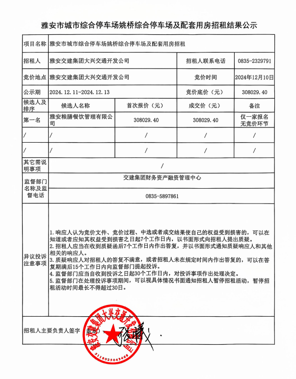 雅安市城市綜合停車場(chǎng)姚橋綜合停車場(chǎng)及配套用房招租結(jié)果公示