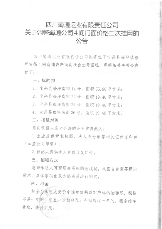 四川蜀通運業(yè)有限責任公司關于調(diào)整蜀通公司4間門面價格二次掛網(wǎng)的公告