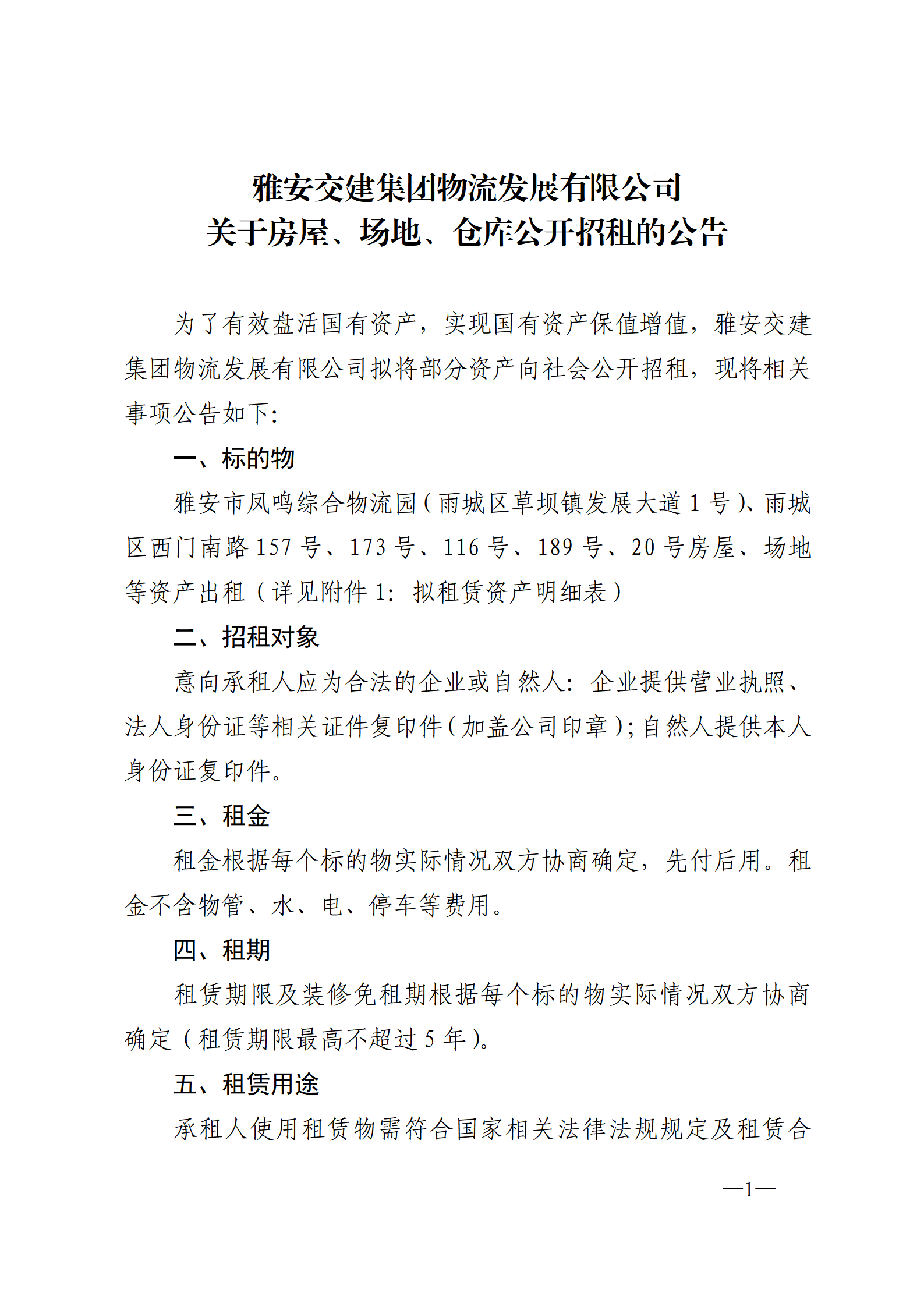 雅安交建集團(tuán)物流發(fā)展有限公司 關(guān)于房屋、場(chǎng)地、倉(cāng)庫(kù)公開招租的公告