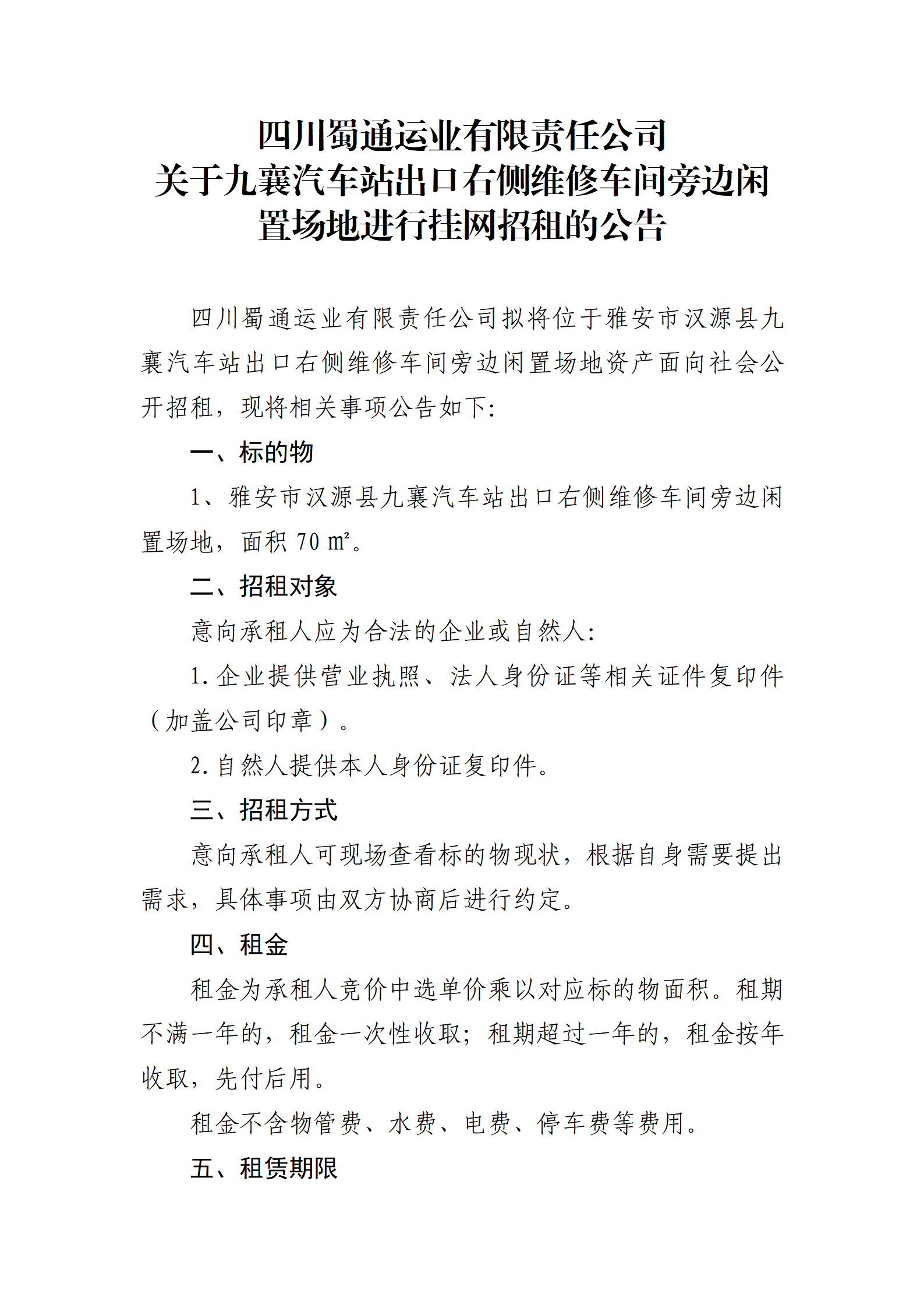 四川蜀通運業(yè)有限責(zé)任公司 關(guān)于九襄汽車站出口右側(cè)維修車間旁邊閑置場地進行掛網(wǎng)招租的公告