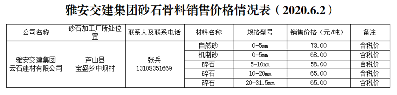 云石建材有限公司。云石公司是蘆山縣人民政府指定蘆山縣投資經(jīng)營(yíng)管理有限責(zé)任公司與雅安市交通建設(shè)(集團(tuán))有限責(zé)任公司共同組建的合資公司。公司在蘆山縣寶盛鄉(xiāng)中壩村建立砂石生產(chǎn)線,年產(chǎn)各類砂石骨料約50萬噸,生產(chǎn)廠區(qū)距雨城區(qū)中心城區(qū)約60公里。