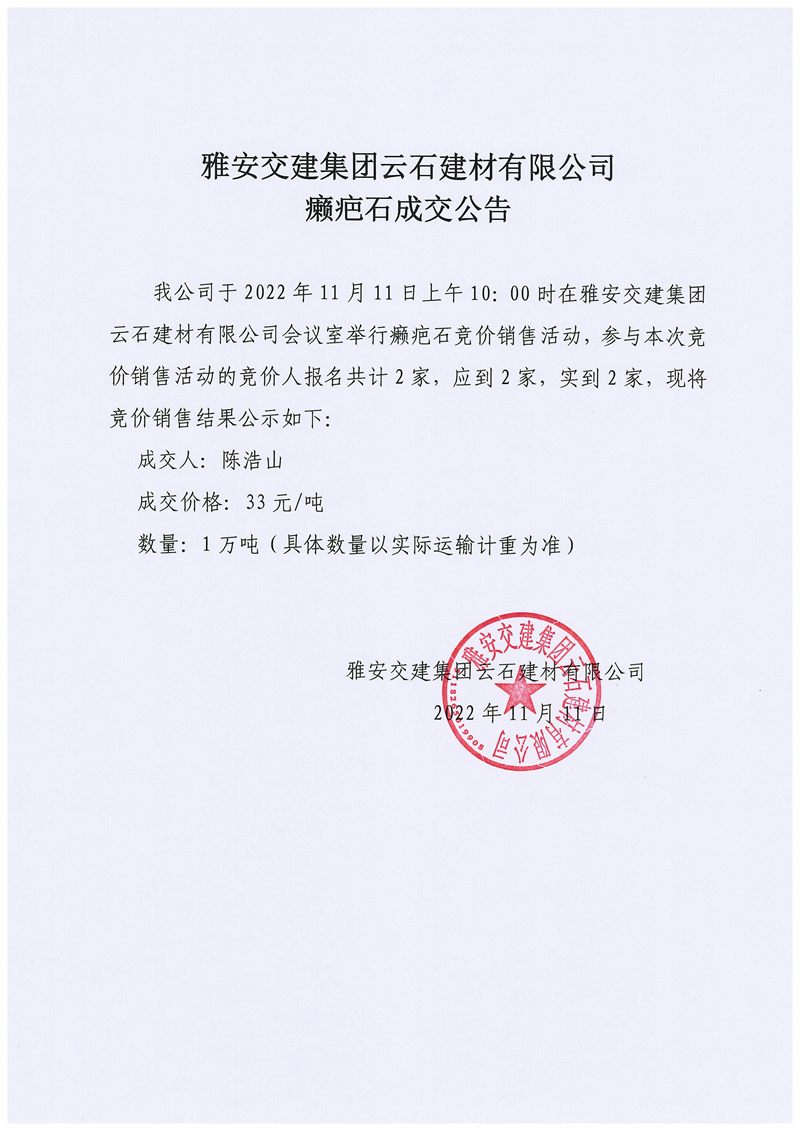 雅安交建集團(tuán)云石建材有限公司癩疤石成交公告11.11
