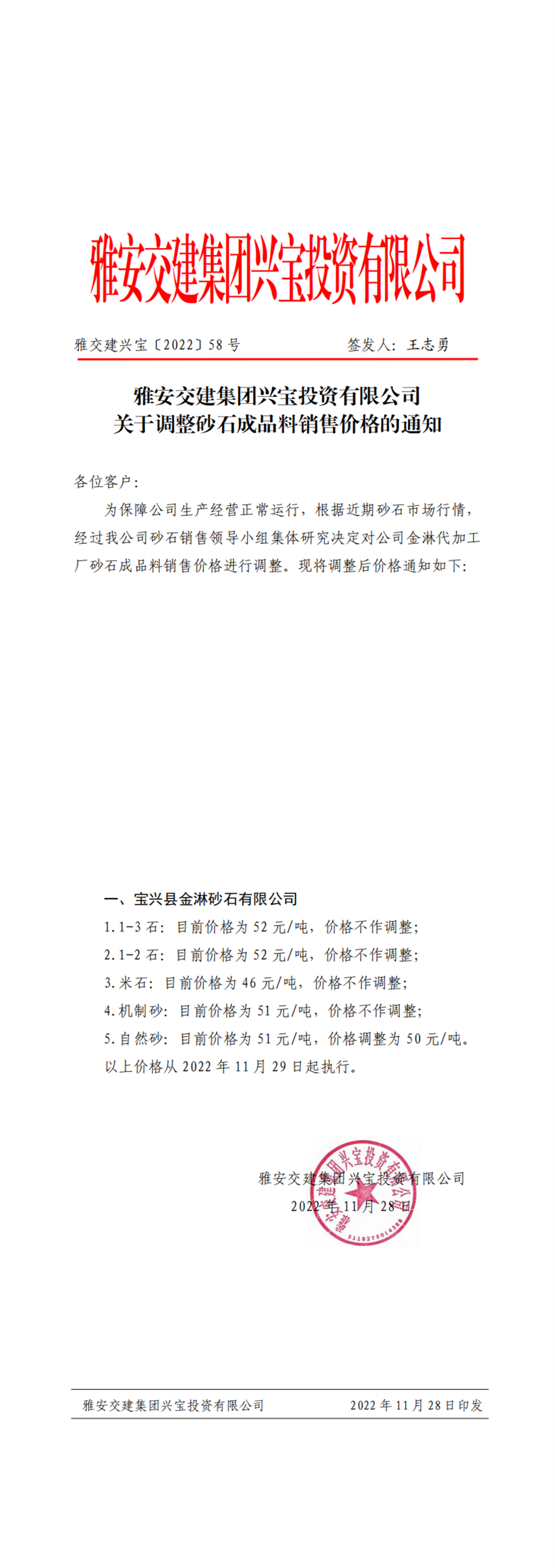雅交建興寶〔2022〕58號(hào) 關(guān)于調(diào)整砂石成品料銷(xiāo)售價(jià)格的通知