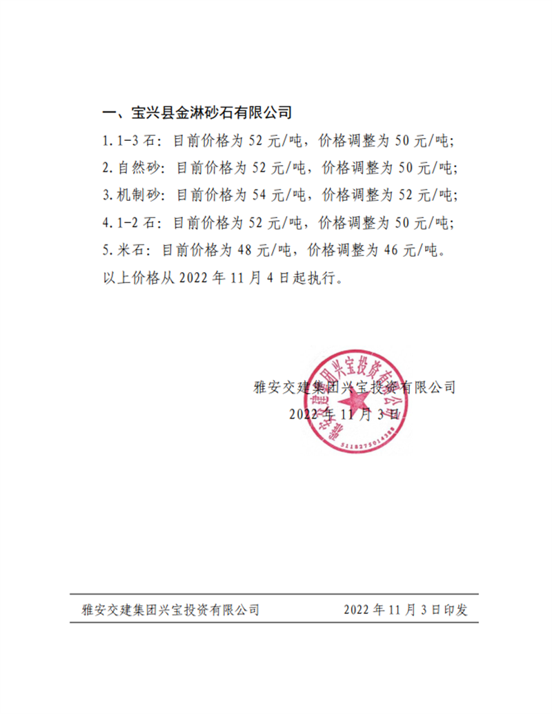雅交建興寶〔2022〕55號 關于調整砂石成品料銷售價格的通知-11.5