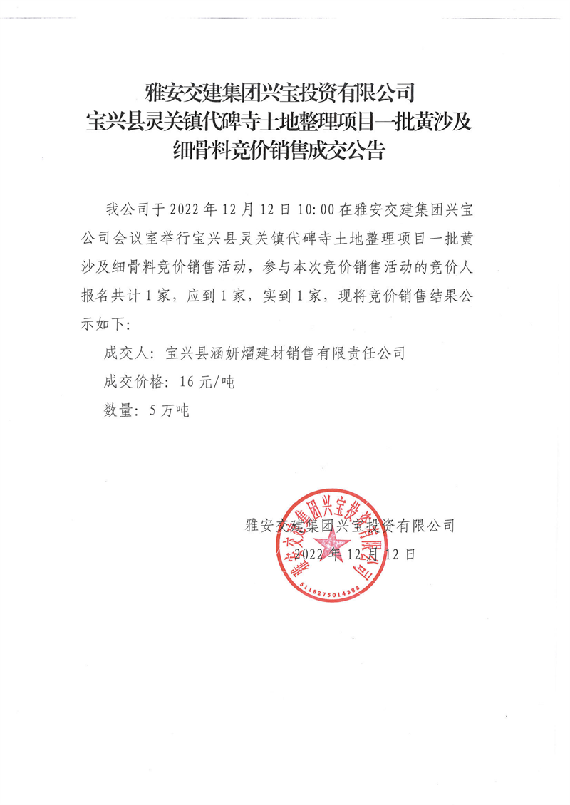 雅安交建集團(tuán)興寶投資有限公司寶興縣靈關(guān)鎮(zhèn)代碑寺土地整理項目5萬噸黃沙及細(xì)骨料競價銷售成交公告(2022-12-12)
