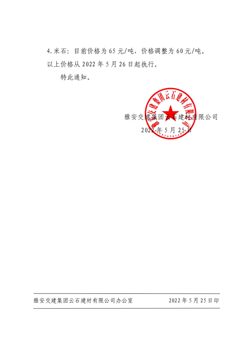 雅安交建集團云石建材有限公司 關于調整成品料價格的通知--2022-5-25