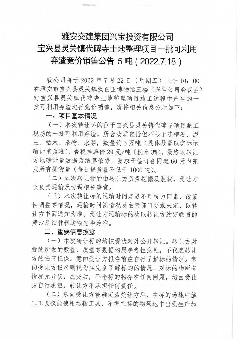 寶興縣靈關鎮(zhèn)代碑寺土地整理項目一批可利用棄渣競價銷售公告7.18(5萬噸)