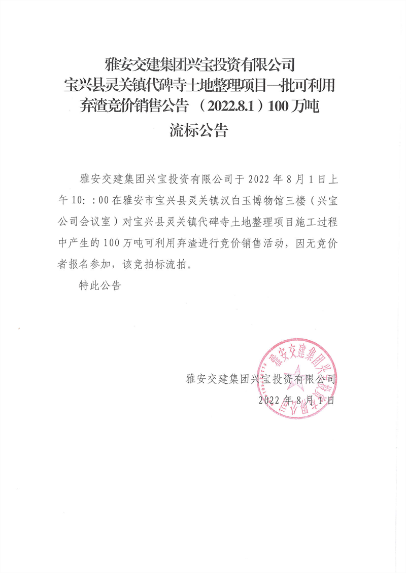 雅安交建集團(tuán)興寶投資有限公司靈關(guān)鎮(zhèn)代碑寺土地整理項目100萬噸可利用棄渣競價銷售流標(biāo)公告(2022.8.1)