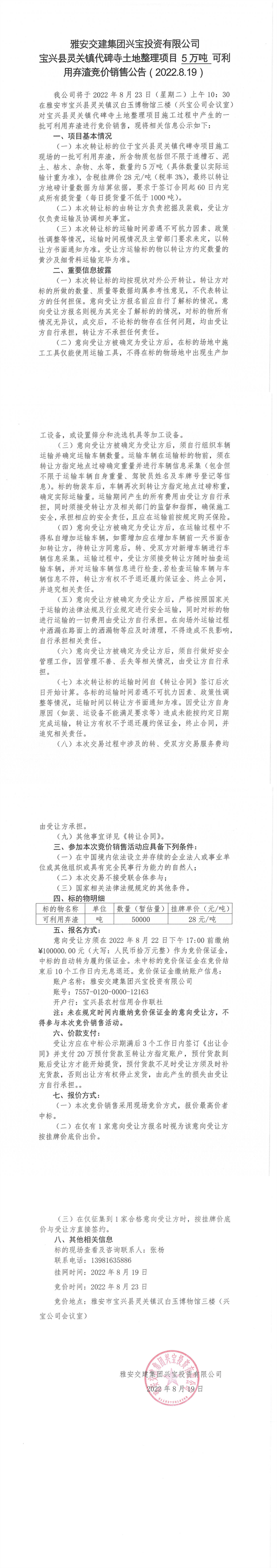雅安交建集團(tuán)興寶投資有限公司靈關(guān)鎮(zhèn)代碑寺土地整理項(xiàng)目5萬(wàn)噸可利用棄渣競(jìng)價(jià)銷(xiāo)售公告(2022.8.19)(1)