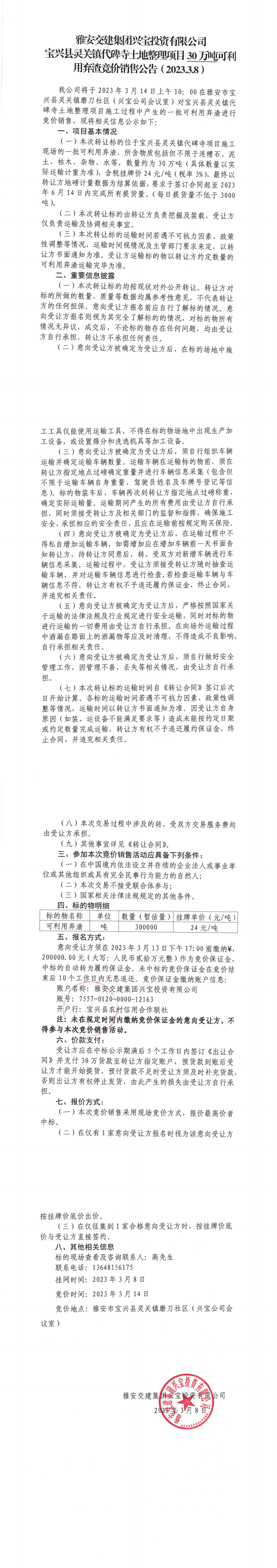 雅安交建集團興寶投資有限公司靈關鎮(zhèn)代碑寺土地整理項目50萬噸可利用棄渣競價銷售公告(2023.3.7)