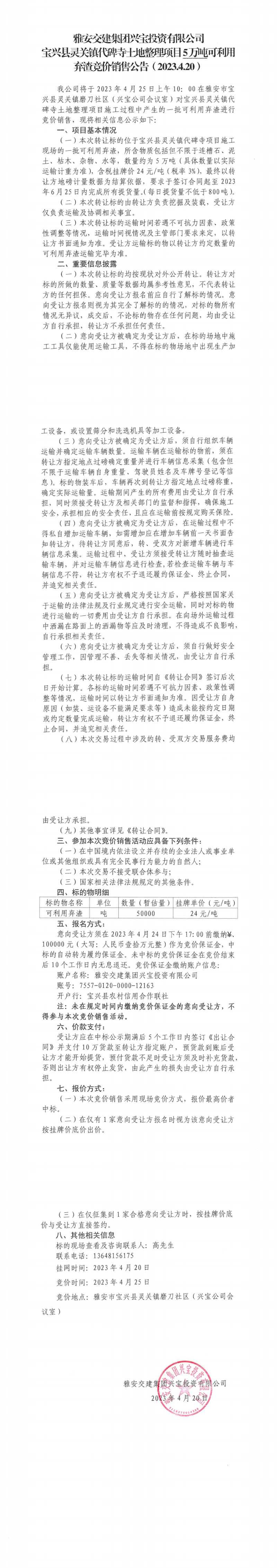 雅安交建集團興寶投資有限公司靈關(guān)鎮(zhèn)代碑寺土地整理項目5萬噸可利用棄渣競價銷售公告(2023.4.20)