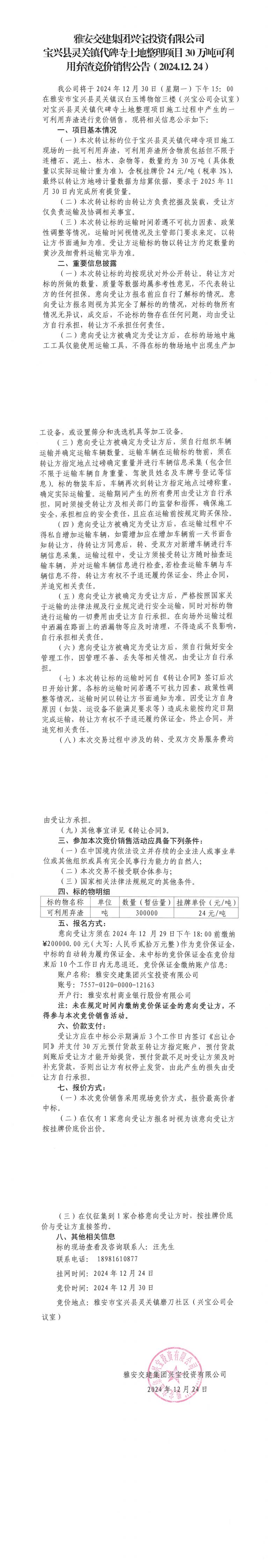 雅安交建集團興寶投資有限公司靈關(guān)鎮(zhèn)代碑寺土地整理項目10萬噸可利用棄渣競價銷售公告(2024.12.24)