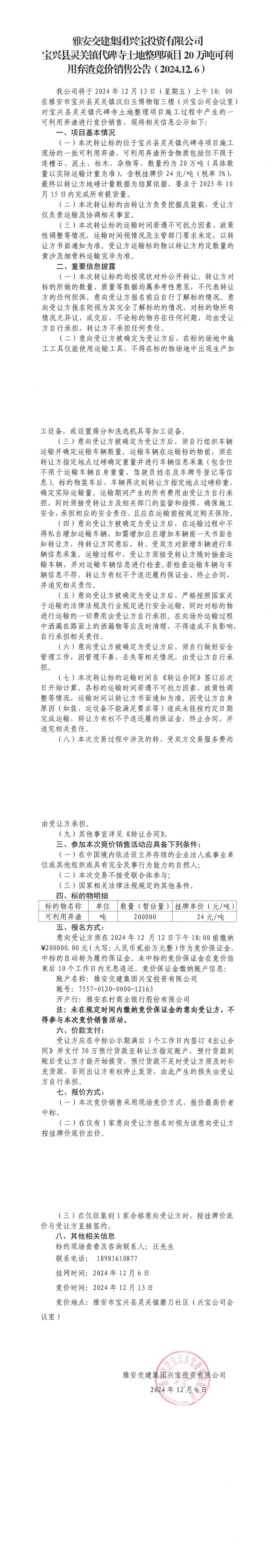 雅安交建集團(tuán)興寶投資有限公司靈關(guān)鎮(zhèn)代碑寺土地整理項目20萬噸可利用棄渣競價銷售公告(2024.12.06)